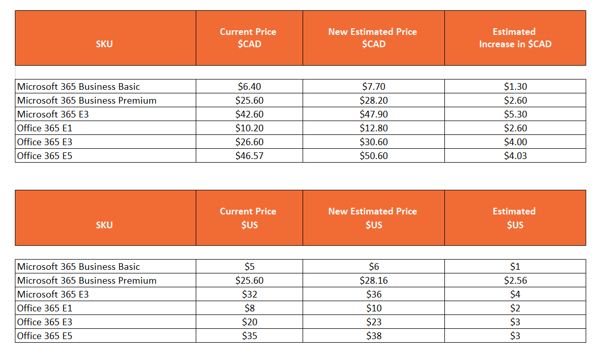 We have put together an estimate of the new prices based off of the US dollar prices that have been made public by Microsoft. Official Canadian pricing with the actual prices in Canadian dollars will be communicated to you as soon as Microsoft releases them.